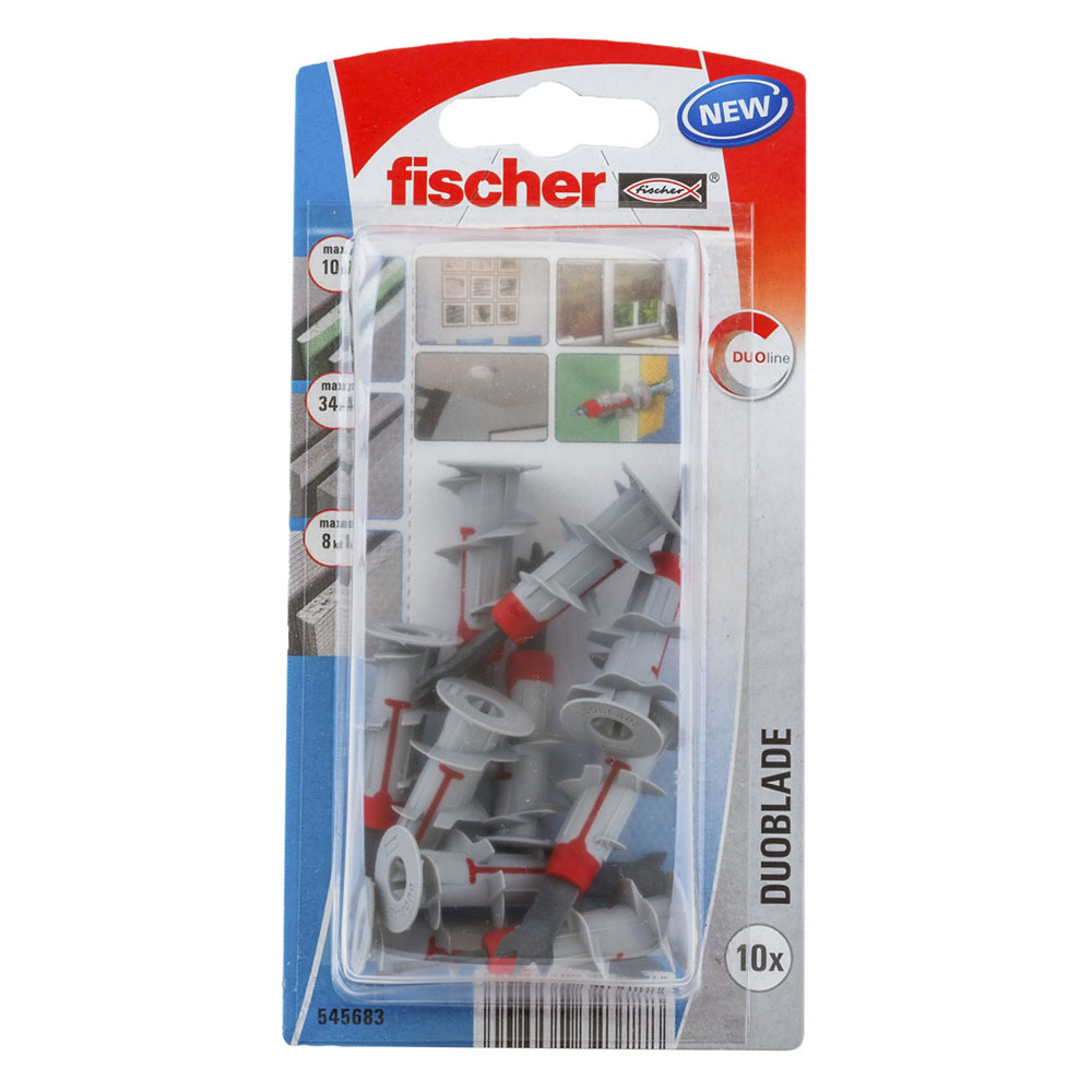 El fischer DUOBLADE es el miembro más joven de la innovadora família DUO-line. Contiene diferentes componentes que permiten obtener el mejor rendimiento. La punta autoperforante permite un proceso de perforación limpio y eficaz. La fijación se atornilla en la instalación colocada previamente con el destornillador (inalámbrico) a ras de la superficie de la placa de yeso. El DUOBLADE de fischer es adecuado para tornillos para madera, metal y aglomerado de 4 a 5 mm de grosor, así como para diferentes ganchos y tornillos de argolla. Por lo tanto, es apropiado para fijar, por ejemplo, detectores de humo, barras de cortina y persianas, de forma rápida y segura.