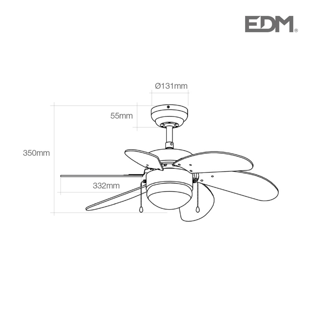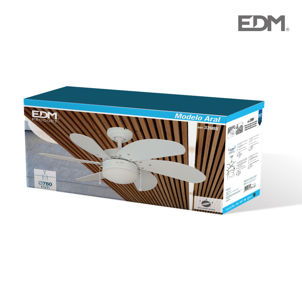 VENTILADOR DE TECHO MODELO ARAL BLANCO 50W Ø ASPAS 76 cm 6 VELOCIDADES ( INTERRUPTOR TIRADOR ) CAUDAL DE AIRE 4409m3/h AC-220/240V - 50Hz LUZ ( 1 x E14 MAX.60 W MAX. 8,7CM NO INCLUIDA--INTERRUPTOR TIRADOR ) 6 ASPAS IP20 EDM